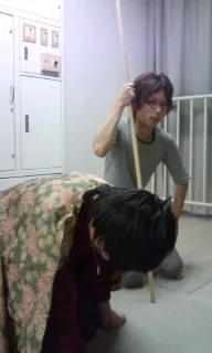 これも今回の舞台の1シーン……ではなく、基礎練習中の風景です。 出されたお題に合わせてひとつのシーンを作り出す、「ポートレート」という基礎練習の中の一コマでした。 ちなみにお題は「妖怪大戦争」。皆さん思い思いの妖怪大戦争を表現していて、稽古場は混沌としていました。こちらの三方は妖怪三兄弟だそうです。